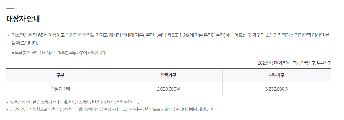 우선적으로 만 65세 이상에 해당이 되어야 한다는 것과, 대한민국 국적을 두고 대한민국에 거주하고 있어야 한다는 전제조건이 있습니다. 이 후 소득요건을 따지게 되는데, 단독가구와 부부가구별로 소득선정액 기준이 다릅니다.